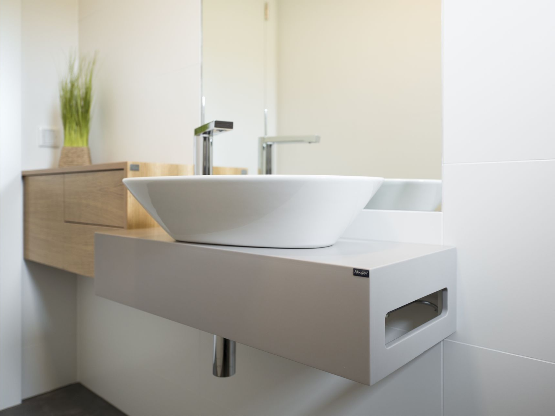 Waschtische mit integriertem Stauraum und passgenauen Ausschnitten für Anschlüsse.